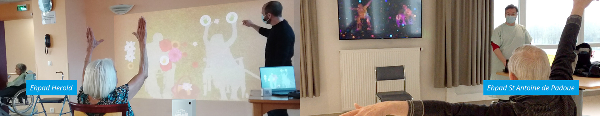 C’est une installation nomade, simple à mettre en place. IRIS capte les mouvements effectués par une ou plusieurs personnes pour les intégrer dans des environnements métaphoriques. Grâce à leurs silhouettes projetées, les résidents interagissent avec les différents environnements virtuels proposés, adaptés en fonction de leurs atteintes neurologiques.
